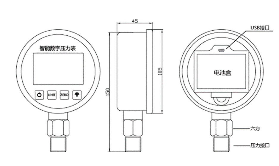 SUAY80智能壓力表是一款高精度智能型數字壓力表,內置高精度壓力傳感器,能夠準確的實時顯示壓力,并且具有精度高、長期穩定性好的特點。配備5位顯示的大尺寸LCD液晶顯示,具有清零、背光、開關機、單位切換、低電壓報警、峰值記錄等多種功能,操作簡單,安裝方便。殼體和接頭采用304不銹鋼,抗震性好,能夠測量氣體、液體、油等對不銹鋼無腐蝕的介質。用3節5號電池供電,也可以采用USB供電,續航功耗低、時間長,適用于便攜式壓力測量、設備配套、校驗設備等壓力測量領域。